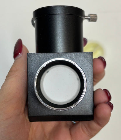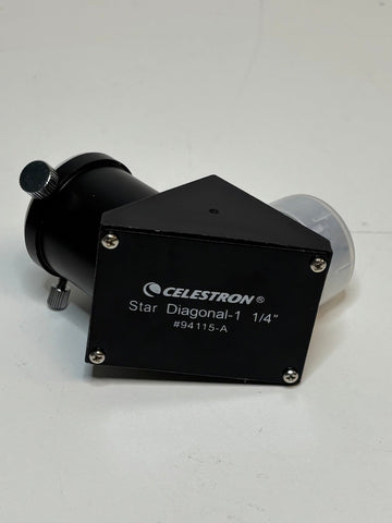 This is a used 1.25'' standard Celestron star diagonal. It is in good condition, with a little dusty optics and worn body as seen in the pictures provided. This has both dust caps and does not include original box.