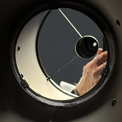 - The 10" mirror sits at the end of the OTA in an adjustable mirror cell. When it comes time to make adjustments to your mirror for precise alignment, use the included Laser Collimator and then tweak the mirror's position in the cell with the hand-adjustable knobs. No tools are needed except your hands!