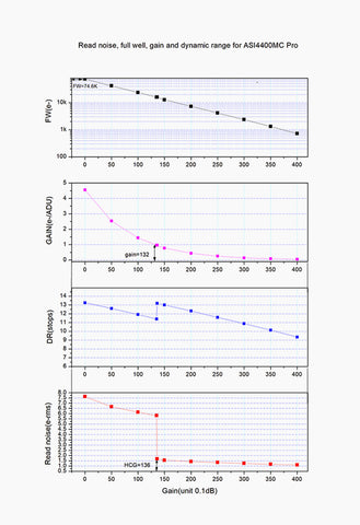 The ASI4400MC Pro offers a dynamic range of up to 13 stops, allowing it to capture both bright highlights and faint shadow details in a single exposure. This wide range is key to achieving high dynamic range (HDR) performance, preserving fine tonal transitions and subtle color detail in deep-sky images. When the gain setting reaches 136, the camera automatically activates HCG (High Conversion Gain) mode, which greatly reduces read noise while maintaining full dynamic range. This means you can increase sensitivity for faint targets without adding unwanted gain noise, making it easier to capture clean, detailed images under a variety of conditions.