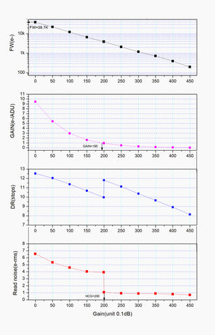 The camera has a built-in HCG mode, which can effectively reduce readout noise at high gain and allow the camera to maintain the same high dynamic range as it does at low gain. When the gain is 200, the HCG mode is automatically turned on and the Dynamic range reaches a level close to 12bit.The readout noise is as low as 0.7e.