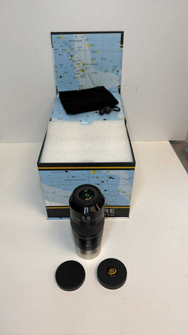 This is an Explore Scientific 5.5mm 100-degree eyepiece in perfect, like new condition. The optics are pristine and the body doesn't have a mark on it. This does include its original box and both dust caps.