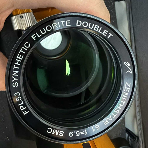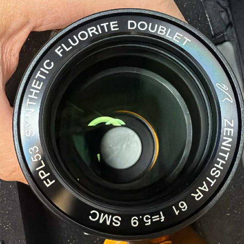 This is a gold ZenithStar 61 with the Flat 61A adjustable flattener, and the Uniguide 32 guidescope. This scope, flattener, and guidescope are in like new condition - the optics are absolutely clean, about as clean as we've ever seen, new or used.