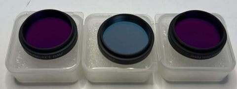 This is a set of three ZWO narrowband filters in the S-II, O-III, and H-a bands in excellent condition. The filters are clean and unmarked - any dust you see in the photos is electrostatically charged and attracted to the filters. They come in the jewel cases shown.