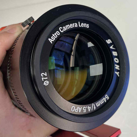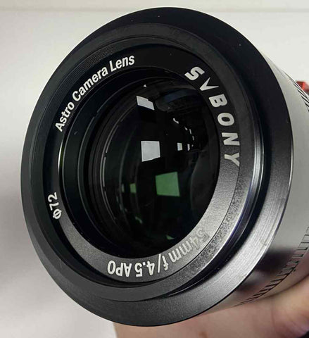 Attached to a camera and your favorite mount, the SV555 54mm f/4.5 APO Astrophotography Lens/Telescope from SVBONY becomes an astrograph for deep-sky object and planetary imaging. Its fully multicoated Petzval lens has five elements in three groups, with two made from extra-low dispersion glass. The fast f/4.5 maximum aperture captures a wide field and the rotatable lens tube makes it easy to select your framing. The SV555 has a 2" M48 x 0.75 female thread on the back and comes with a handle, bracket, and a 7.3" dovetail.