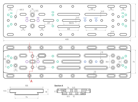 Made with CNC-machined aluminum and anodized, this Losmandy dovetail plate includes eleven M6 threads, four M8 threads, and two 1/4-20 threads. It is 40cm long and weighs 1.43kg.