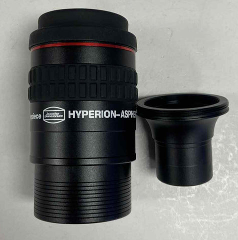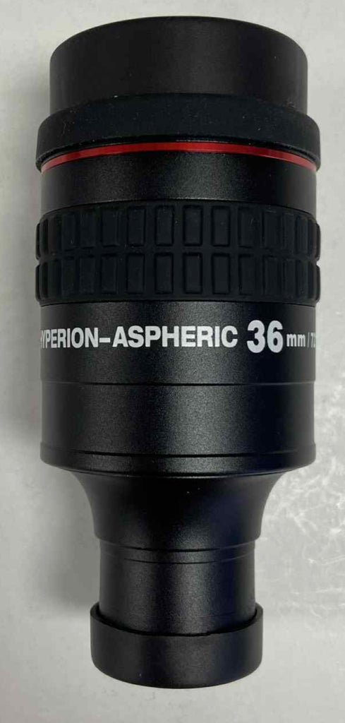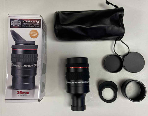 This is a used Baader Hyperion Aspheric 36mm eyepiece in excellent condition. It includes everything that you see in the photos: the eyepiece, the 1.25" adapter, the 2" barrel, the eye cup, dust caps, bag, and original box. The optics are in clean, unmarked condition and the only cosmetic issue is that the text has been scratched off a bit in one spot (shown in the photos).