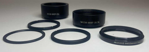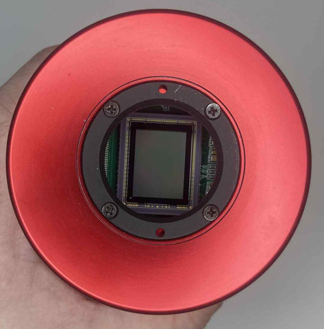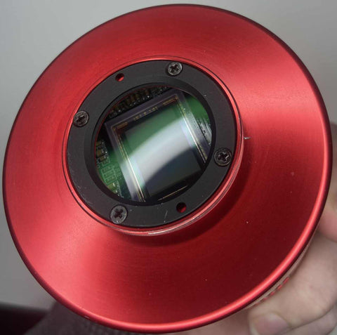 The ASI1600MM-COOL has a robust and attractive CNC machined red-anodized aluminum body that stands up to heavy field use. A clear IR-cut glass window protects the sensor and helps keep images sharp. The camera body includes a standard 2" M42x0.75 internal thread interface on top for adapters, and a 1/4-20 thread in the bottom to make it easy to attach the device to a camera tripod or mount. The M42 adapter can be removed to reduce back focus to just 6.5mm.