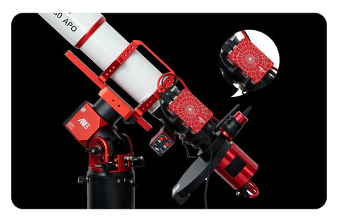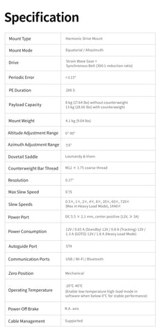 The incorporated Harmonic drive speed reducer and synchronous belt allow this mount head to have precision control. While a traditional equatorial mount requires counterweights for use, this ZWO mount's harmonic drive speed reducer and synchronous belt eliminate the need for counterweights, though they can be added if desired (an M12 thread interface is available for compatible, user-supplied counterweight shafts). Having this design allows for more accurate control and a reduction ratio of 300:1. If counterweights are added, then it should be secured on a counterweight shaft that is no more than 20cm in length.