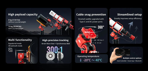 This payload capacity easily accommodates a wide range of telescopes, providing a stable and reliable foundation for your viewing and imaging needs.