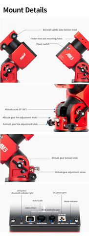 ZWO has designed the AM3N mount with the capability of switching between equatorial or alt-azimuth mount modes. You can switch the mode through the included hand controller or through the app on a smartphone/tablet. The body of the mount comes with a status light indicator that will indicate whether the mount is in an equatorial or alt-azimuth mode. The red light signals the AM3 is in EQ mode and the green light signals the mount is in Alt-azimuth mode. The equatorial mode is great for tracking and imaging celestial objects while the alt-azimuth mode works well for observations.