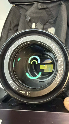 This is a Radian 61 triplet APO with the included flattener, in good condition. There is some minor dust on the inside of the objective that will not significantly affect your data collection. The flattener, however, is clean. Additionally, this scope was definitely used by its previous owner - the body does have some nicks and scratches.