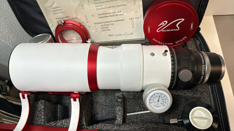 It comes in its original padded case, with the stock rings, handlebar, and Vixen dovetail. It includes not only the Flat 73A focal reducer/field flattener (in black) in very clean condition, but also a black WO M63 camera rotator.