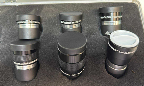 - Five eyepieces and a Barlow lens equals 10 different magnifications to choose from, including the equivalent of a 3 mm, 4 mm, 6 mm, 6.5 mm, 8 mm, 8.5 mm, 13 mm, 16 mm, 17 mm and 32 mm. And that doesn’t include eyepieces you may already have in your collection, which will now achieve double the magnification with the addition of the Barlow.