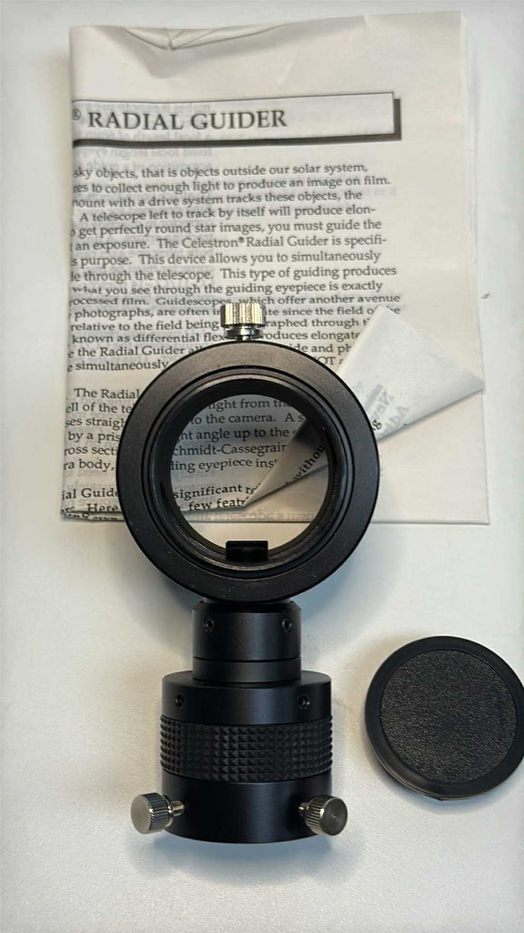 Condition: This is a used Celestron radial guider in good condition. The prism is relatively clean and there are very few markings on the body. This includes the manual, but does not include its original box.