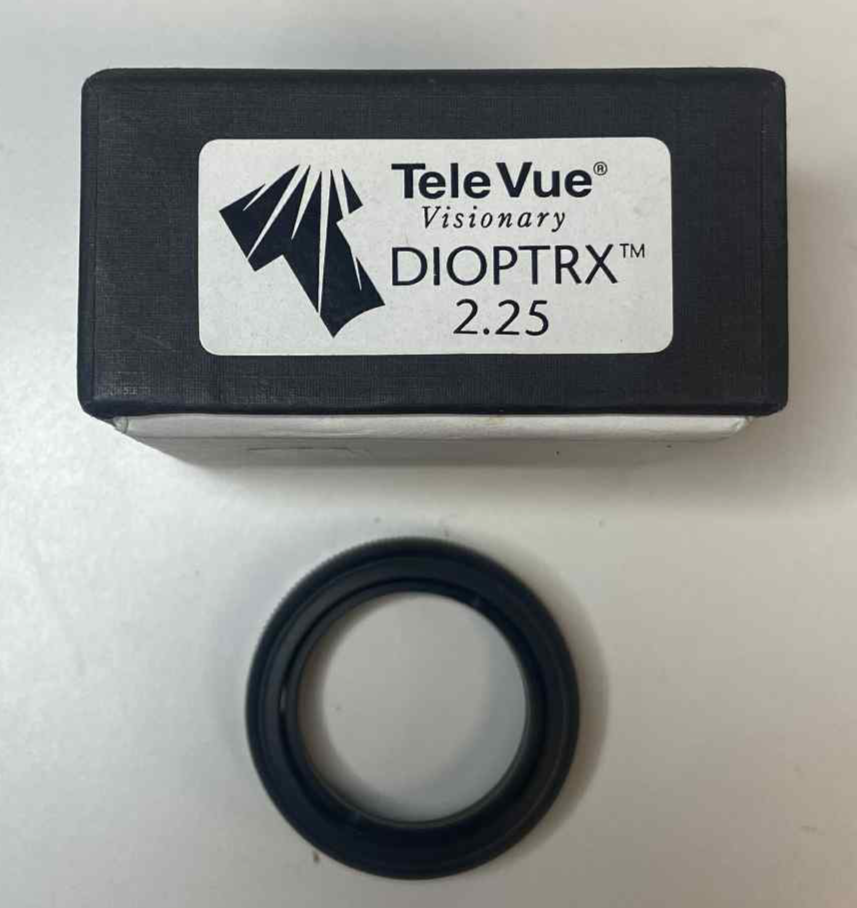 This is a used Tele Vue Dioptrx astigmatism correcting lens for 2.25. It is in excellent condition with mostly clean optics; there is one spot on the edge of the optic which should not distort your view (this is shown in the photos). This does not include any dust caps but does come in the original box.